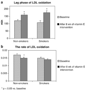 At baseline, the rate of oxidation was higher in nonsmokers than in smokers. The lag phase increased significantly after the supplementation of vitamin E both in smokers and nonsmokers. Native LDL dose dependently tended to reduce the viability of endothelial cells in vitro more markedly when isolated from smokers than from nonsmokers. Vitamin E supplementation had no beneficial effect on the cytotoxicity of oxidized LDLs in endothelial cell culture. On the other hand, simultaneous administration of Trolox®, the water-soluble analogue of vitamin E, attenuated the LDL cytotoxicity on endothelial cells. The vitamin E supplementation to LDL donors attenuated the increase in prostacyclin production both in smokers and nonsmokers.