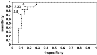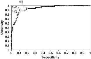 In this sample of elderly patients (age: 85±7 years old), leptin concentration was the only biological parameter significantly related to nutrition status. Independent correlations were found between leptin concentration and BMI, skinfold thickness and sex. The relationship between nutritional status and leptin concentration is significantly different in each sex: the more the patients are undernourished, the lower the leptin concentration in both sexes. The optimal leptin cutoff value for the diagnosis of malnutrition in this population was 4 μg/l in men (sensitivity 0.89, specificity 0.82) and 6.48 μg/l in women (sensitivity 0.90, specificity 0.83).