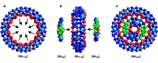 In polyoxometalate chemistry a large variety of compounds, clusters and solid-state structures can be formed by the linking together of well-defined metal–oxygen building blocks1, 2. These species exhibit unusual topological and electronic properties, andfind applications ranging from medicine3 to industrial processes4. The recently reported ring-shaped mixed-valence polyoxomolybdates of the type {Mo154} (refs 5, 6) and {Mo176} (refs 7, 8) represent a new class of giant clusters with nanometre-sized cavities and interesting properties for host–guest chemistry. Here we describe the formation of related clusters of the type {Mo248} formed by addition of further units to the inner surface of the {Mo176} ‘wheel’. The additional units arrange themselves into two {Mo36} ‘hub-caps’ on the initial wheel—clusters that are not stable in isolation. These findings reveal a new pathway to the development of complex coordination clusters.