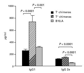 Lethally irradiated AKR mice received BMT from H-2D and minor lymphocyte stimulatory (Mls)-1 disparate B10.A mice. No GVHD signs were detected in AKR recipients of T cell-depleted BM cells (1 × 107) alone ([B10.A → AKR] T−). When B10.A splenic T cells (1 × 105) were injected in addition to T cell-depleted BM cells ([B10.A → AKR] T+), overt GVHD was observed. [B10.A → AKR] T+ chimeras recovered from the GVHD 8 weeks after BMT. In T cells from these [B10.A → AKR] T+ chimeras, a substantial population of Mls-1a-reactive Vβ6+ T cells was present, whereas the Vβ6+ cells were deleted in [B10.A → AKR] T− chimeras. T cells from [B10.A → AKR] T+ chimeras showed considerable MLR but no CTL response against AKR cells (split tolerance). Upon stimulation with AKR stimulators or anti-CD3 MoAb, T cells from [B10.A → AKR] T+ chimeras produced significantly more IL-4 but significantly less IFN-γ compared with those from [B10.A → AKR] T− chimeras or unmanipulated B10.A mice. The serum level of IgG1 in [B10.A → AKR] T+chimeras was also significantly higher than that in [B10.A → AKR] T− or B10.A mice. The present findings suggest that the split tolerance observed in BMT chimeras recovered from GVHD is attributable to the Th2 dominant state. Bone Marrow Transplantation (2000) 26, 1069–1076.