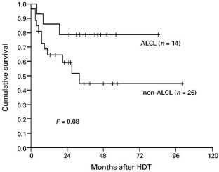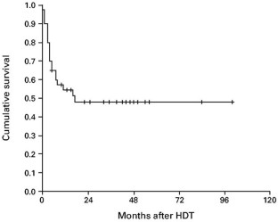 Peripheral T cell lymphomas (PTCL) have a poorer prognosis after conventional treatment than do high-grade B cell lymphomas. The place for high-dose therapy (HDT) with autologous stem cell support in these patients is still not clear. Forty patients, 10 women and 30 men, median age 41.5 years (range 16–61) with PTCL were treated with HDT and autologous stem cell support at The Norwegian Radium Hospital, Oslo, Norway and The University Hospital, Uppsala, Sweden, between February 1990 and September 1999. The histologic subtypes were: PTCL unspecified, 20 patients; intestinal, two patients; angioimmunoblastic (AILD), two patients; angiocentric, two patients and anaplastic large cell lymphoma (ALCL), 14 patients. All patients had chemosensitive disease and had received anthracycline-containing regimens prior to transplantation. At the time of HDT, 17 patients were in first PR or CR and 23 were in second or third PR or CR. Conditioning regimens were BEAM in 15 patients, BEAC in 14 patients, cyclophosphamide and total body irradiation (TBI) in eight patients, BEAC, without etoposide and TBI in one patient and mitoxantrone and melphalan in two patients. There were three (7.5%) treatment-related deaths. The estimated overall survival (OS) at 3 years was 58%, the event-free survival (EFS) 48% and the relapse-free survival (RFS) 56%, with a median follow-up of 36 months (range 7–100) for surviving patients. The patients with ALCL tended to have a better prognosis compared to those with other PTCL subtypes, OS 79% vs 44%, respectively. In conclusion, patients with chemosensitive PTCL who are failing to achieve CR with first-line chemotherapy or are in relapse can successfully be treated with HDT and autologous stem cell support. Bone Marrow Transplantation (2001) 27, 711–716.