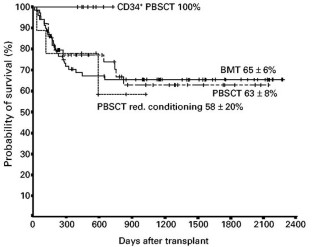 The detection of chimerism, residual molecular and cytogenetic disease following transplantation of peripheral blood stem cells (PBSCT) with a nonmyeloablative conditioning (n = 9) and the transplantation of highly purified CD34+ stem cells (CD34+ PBSCT) (n = 16) were compared to unmanipulated bone marrow transplantation (BMT) (n = 69) and unmanipulated PBSCT (n = 50) after myeloablative conditioning in patients with first chronic phase of chronic myelogenous leukemia (CML) (n = 137), second chronic phase of CML (n = 4), acute lymphoblastic leukemia (n = 2) and acute myeloid leukemia (n = 1). A molecular relapse (MR) as defined by two consecutive positive polymerase chain reaction assays for the detection of M-bcr-abl transcripts (n = 141) and cbfβ-myh11 transcripts (n = 1) in a 4-week interval was found in 10 of 16 patients (63%) after CD34+ PBSCT, and in 27 of 69 patients (39%) after BMT, whereas only three of 50 patients (6%) after PBSCT (P < 0.001) and one of eight patients (13%) after PBSCT with reduced conditioning suffered from a MR. A cytogenetic relapse occurred in five of 16 patients (31%) after CD34+PBSCT and 21 of 69 patients (30%) after BMT (NS) compared to two of 50 patients (4%) after PBSCT and none of the eight patients after PBSCT with reduced conditioning (P < 0.05). The lowest treatment-related mortality was seen in the 16 patients after CD34+ PBSCT, who are all currently alive with a median follow-up of 15 months, whereas the survival rate for BMT, PBSCT and PBSCT with reduced conditioning were 65%, 63% and 58%, respectively. Multivariate analysis including all potential influential factors of post-transplant residual disease recurrence showed that patients after CD34+ PBSCT had a significantly higher risk (two times) to develop a MR than patients after BMT (P < 0.03), whereas patients after unmanipulated PBSCT had a significant lower risk (eight times) for the occurrence of a MR post transplant (P < 0.001). Patients after BMT and CD34+ PBSCT had the lowest rates of complete chimerism (CC) at 3 months after transplant. Only five of nine patients (55%) after CD34+ PBSCT and 19 of 33 patients (58%) after BMT achieved CC compared to 19 of 22 (86%) patients after PBSCT and seven of eight (88%) patients after PBSCT with reduced conditioning (P < 0.05). Bone Marrow Transplantation (2001) 27, 809–815.