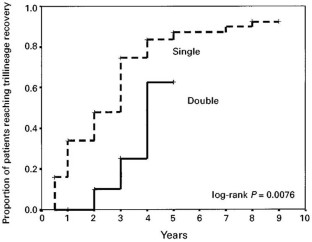 Long-term peripheral blood counts and factors influencing long-term trilineage haematological recovery of consecutive patients in a single institution treated with high-dose chemotherapy (HDC) and ABMT or PSCT for solid tumours were examined. Patients with a relapse-free survival of <1 year were included in the analysis (n = 131). Peripheral blood counts were examined 6 months and yearly following transplantation. Median follow-up was 4.1 years (range 1–10+ years). Three years after transplantation 91% of patients had normal white blood counts (WBC), 94% normal haemoglobin (Hb) and 75% normal platelets. Trilineage recovery was complete in 70% (n = 83) at 3 years and 85% (n = 50) at 5 years. Recovery of Hb occurred before WBC and platelet recovery. Approximately 25% of patients displayed an elevated MCV throughout the follow-up period. These long-term results were independent of age, high-dose regimen, number of reinfused stem cells and stem cell source. Double (n = 12) vs single (n = 119) transplantations showed significantly slower trilineage recovery and higher MCV. No secondary graft failure, myelodysplasia or leukaemia was encountered. In conclusion, complete trilineage recovery after HDC followed by ABMT or PSCT occurs slowly. PSCT and ABMT are capable of maintaining long-term haematopoiesis. Slower recovery is seen after double transplantations. The results suggest lasting implications for bone marrow function after autologous transplantation. Bone Marrow Transplantation (2001) 27, 959–966.