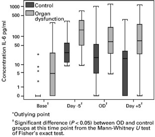 Patients receiving high-dose preparation for stem cell transplantation are at risk for organ dysfunction (OD). Signs of early OD include hypoxia, mental status changes, and liver dysfunction. These early signs have not been correlated with potential cytokine mediators. We compared plasma concentrations of IL-6, TNF-α, and IL-10 in OD patients and controls. Cytokines were measured before preparation, 5 days before OD, day of OD, and 5 days after OD. TNF-α and IL-10 were not measurable prior to preparation. IL-10 was more likely to be measurable in OD patients than in controls 5 days prior to onset of OD (P = 0.039), on the day of OD (P = 0.023), and 5 days later (P < 0.0001). TNF-α was more likely to be measurable only on the day of OD (P = 0.0035). IL-6 was significantly elevated in OD patients at all time points. Patients who had measurable IL-6 on admission were 5.1 times more likely to develop OD (95% CI = 1.4–17.9; P = 0.011). Five days prior to OD for each 100 pg/ml increase in IL-6, patients were 2.75 times more likely to develop OD (95% CI = 1.3–5.8; P = 0.0087). The early elevation of IL-6 in patients who develop OD may help identify a high risk group where preventive therapies can be evaluated. Bone Marrow Transplantation (2001) 28, 889–893.