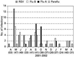 Respiratory viruses (RVs) frequently cause severe respiratory disease in bone marrrow transplant (BMT) recipients. To evaluate the frequency of RV, nasal washes were collected year-round from BMT recipients with symptoms of upper respiratory tract infection (URI). Direct immunofluorescence assay was performed for respiratory syncytial virus (RSV), influenza (Flu) A and B, adenovirus and parainfluenza (Paraflu) virus. Patients with RSV pneumonia or with upper RSV infection, but considered at high risk for developing RSV pneumonia received aerosolized ribavirin. Oseltamivir was given to patients with influenza. A total of 179 patients had 392 episodes of URI. In all, 68 (38%) tested positive: RSV was detected in 18 patients (26.4%), Flu B in 17 (25%), Flu A in 11 (16.2%) and Paraflu in 7 (10.3%). A total of 14 patients (20.6%) had multiple RV infections or coinfection. RSV pneumonia developed in 55.5% of the patients with RSV-URI. One of the 15 patients (6.6%) with RSV pneumonia died. Influenza pneumonia was diagnosed in three patients (7.3%). RSV and influenza infections peaked in fall–winter and winter–spring months, respectively. We observed decreased rates of influenza and parainfluenza pneumonia and low mortality because of RSV pneumonia. The role of antiviral interventions such as aerosolized ribavirin and new neuraminidase inhibitors remains to be defined in randomized trials.