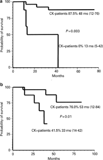 The purpose of this study was to evaluate the incidence and extent of tumour cell contamination in bone marrow specimens and stem cell collections from 34 breast cancer patients undergoing high-dose therapy as adjuvant treatment, and to determine the prognostic significance for the clinical outcome. Tumour cell contamination was evaluated by flow cytometry using a double-colour test and an anti- Pan cytokeratin (CK) antibody. Two out of 34 (6%) baseline bone marrow specimens, none of seven marrow harvests and nine out of 32 aphereses (28%) mobilised from seven out of 27 patients (26%) contained CK+ cells. Tumour contamination was more frequent in patients with 10 or more involved lymph nodes and in those who received a shorter course of adjuvant chemotherapy before mobilisation. At a median follow-up of 43 months, 24 patients are in complete remission, whereas 10 patients experienced recurrence. Out of the 10 patients who relapsed, five (50%) had CK+ peripheral blood stem cell (PBSC) collections, whereas disease recurrence was seen in only two out of 24 (8%) patients who received CK− products (P=0.02). Moreover, CK+ PBSC collections were associated with a significantly shorter event-free survival and overall survival. CK+ collection is an unfavourable prognostic factor for patients treated with high-dose therapy. Whether the negative impact on clinical outcome depends on reinfusion of tumour cells or whether it simply indicates a larger disease extension is still unclear.