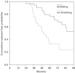 This is a retrospective analysis of 188 children who underwent total body irradiation (TBI) in one or two fractions before bone marrow transplantation (BMT) for a hematological disorder. While 139 children had eye shielding during TBI to decrease cataract formation, 49 did not. The blocks used for shielding caused cylindrical areas of decreased dose intensity in the brain. The aim of the study was to determine if there was an increased risk of relapse in the eyes or in the CNS after shielding of the eyes. The probability and severity of cataract formation with and without shielding were also evaluated. None of the 49 children without shielding had a relapse in their eyes or in the CNS after BMT. Of the children with shielding, none had a relapse in the eyes but two of the 139 (1.4%) had a CNS relapse. The incidence of cataracts without shielding was 90% (19 of 21 evaluable patients), while with shielding it was 31% (20 of 64). Severe cataracts were present in eight of 21 (38%) patients without and two of 64 (3%) patients with shielding. The probability of staying cataract free for at least five years was 0.77 with and 0.33 without shielding, at 8 years it was 0.53 and 0.24 respectively. The relative risk of developing a cataract without shielding vs shielding was three (95% CI=1.5; 5.9). It appears that the incidence of relapse in the eyes and CNS is not increased when the eyes are shielded during TBI. Shielding increased the latency time of cataract formation and decreased the severity of cataracts.