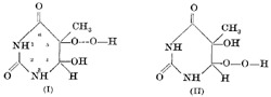 WEISS et al.1 have shown that X-irradiation of aerated aqueous solutions of nucleic acids, pyrimidine nucleotides or pyrimidine bases gives rise to hydroperoxides. In the case of thymine, they proposed the following possible structures: