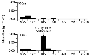 Earthquakes are commonly cited as one possible triggering mechanism for turbidity flows—dense sediment–water plumes that can transport large volumes of sediment great distances down slope—in both marine and lacustrine settings1,2,3,4,5,6. Heezen and Ewing1 were the first to make such a suggestion, attributing breaks in a sea-floor telephone cable in the North Atlantic Ocean to turbidity flows generated by the 1929 Grand Banks earthquake. Anumber of workers have consequently used sedimentary turbidite records to reconstruct the earthquake histories of various regions2,7,8. Here we present direct observations of a seismically induced turbidity flow. Measurements of light scattering and sediment fluxes in the Cariaco basin indicate that the earthquake that occurred along the coast of northern Venezuela on 9 July 1997 resulted in considerable downslope displacement of sediments—probably >105 tonnes into the deep part of the basin. In such a seismically active region, this mechanism of sediment transport may be responsible for a significant component of the long-term sediment accumulation in the basin. Furthermore, this process may result in the sequestration in deep sea sediments of large amounts of carbon initially deposited at shallow depths.