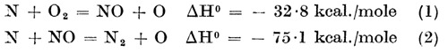 the former reaction is very slow at room temperature, while the latter is extremely rapid. Kistiakowsky and Volpi1 obtained a value of 2 × 1012 exp(−6200/ R.T.) cm.3 mole−1sec.−1 for k1 from a mass spectrometric investigation of the reaction between nitrogen atoms and oxygen molecules in a stirred reactor between 390° and 520° K. while a value of 1.7 × 1013 exp(−7,500/R.T.) can be obtained from Kaufman's2 work on the oxygen-sensitized decomposition of nitric oxide between 1,500° and 1,700° K. No direct determination of k2 appears to have been reported, although values of 2 × 1011 (ref. 3) and a lower limit of 5 × 1013 cm.3 mole−1sec.−1 (ref. 1) have been recorded.