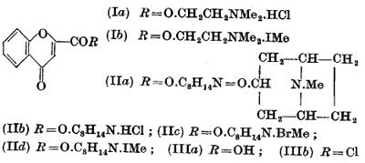 WITH the view of further pharmacological work by one of us (K. V.-B.), it was decided to synthesize certain esters of chromone-2-carboxylic acid, not previously described1–4. The following compounds were obtained : dimethylaminoethyl-chromone-2-carboxylate hydrochloride (Ia), the methiodide of the base (Ib); tropyl-chromone-2-carboxylate (IIa), its hydrochloride (IIb), methobromide (IIc) and methiodide (IId):
