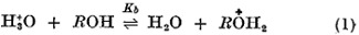 ALTHOUGH the early measurements of acid-base equilibria in dilute solutions of water in alcohols made by Goldschmidt et al.1,2showed that water is more basic than an alcohol in these conditions, the variation of acidity function with ethanol–water composition3showed that differences must exist between solutions of water in ethanol and solutions of ethanol in water. This has been supported recently by a kinetic investigation4of the retardation of oxidation in dilute acidic solutions of alcohols and ethers in water. The retardation is caused by the formation of an unreactive oxonium ion, with the alcohol or ether more basic than water, for example, for