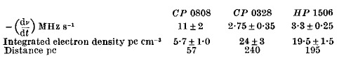 THE dispersion values for the pulsating radio sources listed in ref. 1 are unfortunately in error. An error in the measurement of the cable lengths which determine the dispersion has meant that the values given in Table 1 of frequency sweep, integrated electron density and distance should read