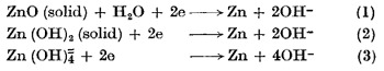 MUCH attention has been given recently to developing a high energy density secondary battery based on the zinc/air electrochemical system. These batteries consist of several divided cells comprising a zinc anode, air cathode, and an electrolyte of aqueous potassium hydroxide of strength ranging from 2 to 9 M. During discharge the overall chemical reaction occurring in the battery may be regarded simply as the formation of zinc oxide from its elements. During the charging cycle the zinc is recovered according to the following reactions