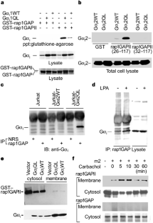 Many receptors for neuropeptides and hormones are coupled with the heterotrimeric Gi protein, which activates the p42/44 mitogen-activated protein kinase (ERK/MAPK) cascade through both the α- and βγ-subunits of Gi (1–3). The βγ-subunit activates the ERK/MAPK cascade through tyrosine kinase4,5,6. Constitutively active Gαi2 (gip2) isolated from adrenal and ovarian tumours7,8 transforms Rat-1 fibroblasts and also activates the ERK/MAPK cascade by an unknown mechanism9,10. The ERK/MAPK pathway is activated by Ras, and is inhibited when the low-molecular-mass GTP-binding protein Rap1 antagonizes Ras function11. Here we show that a novel isoform of Rap1 GTPase-activating protein, called rap1GAPII, binds specifically to the α-subunits of the Gi family of heterotrimeric G-proteins. Stimulation of the Gi-coupled m2-muscarinic receptor translocates rap1GAPII from the cytosol to the membrane and decreases the amount of GTP-bound Rap1. This decrease in GTP-bound Rap1 activates ERK/MAPK. Thus, the α-subunit of Gi activates the Ras-ERK/MAPK mitogenic pathway by membrane recruitment of rap1GAPII and reduction of GTP-bound Rap1.