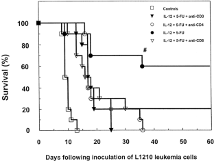 In this study we investigated the efficacy of a combination of IL-12 and 5-FU, a chemotherapeutic exerting several immunomodulatory effects, in murine L1210 leukemia. Mice inoculated with 1 × 105 leukemia cells were treated with a single dose of 5-FU (50 mg/kg) and seven daily doses of IL-12 (100 ng/dose), and were observed for survival. Treatment with IL-12 or 5-FU given alone produced moderate anti-leukemic effects. However, combination of both drugs resulted in a significant prolongation of mouse survival time. Importantly, there were 70% of long-term (>60 days) survivors among mice treated with both agents simultaneously. Moreover, we observed 100% of long-term survivors when mice were treated with a minimally increased dose of IL-12 (170 ng) in combination with 5-FU (50 mg/kg). The antileukemic effects were completely abrogated in scid/scid mice and in mice depleted of peritoneal macrophages and significantly decreased after administration of anti-CD3+, anti-CD4+ or anti-CD8+ monoclonal antibodies. Administration of anti-NK1.1 antibodies did not decrease the antileukemic effects indicating that NK cells are not important effectors of this treatment regimen. Collectively, these results indicate that the combination of IL-12 and 5-FU is inducing strong antileukemic responses that are dependent on the presence and activity of macrophages and T lymphocytes and warrant further studies of combined chemo-immunotherapy with IL-12.