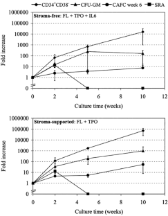 Current technology to numerically expand hemopoietic stem/progenitor cells (HSPC) ex vivo within 1 to 2 weeks is insufficient to warrant significant gain in reconstitution time following their transplantation. In order to more stringently test the parameters affecting HSPC expansion, we followed ex vivo cultures of CD34+-selected umbilical cord blood (UCB) HSPC for up to 10 weeks and investigated the effects of stromal support and cytokine addition. The cytokine combinations included FL + TPO, FL + TPO plus SCF and/or IL6, or SCF + IL6. To identify the HSPC in uncultured and cultured material, we determined the number of colony-forming cells (CFC), cobblestone area forming cells (CAFC), the NOD/SCID repopulating ability (SRA), and CD34+ subsets by phenotyping. The highest fold-increase obtained for CD34+ and CD34+CD38− cell numbers was, respectively, 1197 and 30 937 for stroma-free and 4066 and 117 235 for stroma-supported cultures. In general, CFC generation increased weekly in FL + TPO containing groups up to week 5 with a 28- to 195-fold expansion whereafter the weekly CFC output stabilized. Stroma support enhanced the expansion of CAFC week 6 maximally 11-fold to 89-fold with FL + TPO + IL6. Cultures stimulated with at least FL + TPO gave an estimated 10- to 14-fold expansion of the ability of CD34+ UCB cells to multilineage engraft the BM of sublethally irradiated NOD/SCID mice at 2 weeks of stroma-free and stroma-supported cultures, while at week 5 and later the estimated SRA decreased to low or undetectable levels in all groups. Our results show that stroma and FL + TPO but also inclusion of bovine serum albumin, greatly increase the long-term generation of HSPC as measured by in vitro assays and is indispensable for long-term expansion of CD34+CD38−CXCR4+ cells. However, the different surrogate methods to quantify the HSPC (CD34+CD38−, CFC, CAFC week 6 and SRA) show increasing incongruency with increasing culture time, while especially the phenotypic analysis and the CFC generation greatly overestimate the CAFC and SRA expansion in 10-week cultures.