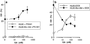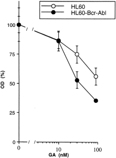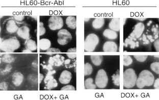 The Bcr-Abl fusion protein drives leukemogenesis and can render leukemia cells resistant to conventional chemotherapy. Geldanamycin (GA), a drug which destabilizes Hsp90-associated proteins, depletes cells of Bcr-Abl, an Hsp90 client, but not of Abl. Both HL60 cells transfected with Bcr-Abl and naturally Ph1-positive K562 leukemia cells are resistant to most cytotoxic drugs, but were found to be sensitive to GA. Furthermore, GA sensitized Bcr-Abl-expressing cells to doxorubicin (DOX) and paclitaxel (PTX). In contrast, in parental HL60 cells, 90 nM GA inhibited PARP cleavage, nuclear fragmentation, and cell death caused by 500 ng/ml DOX. Like GA, STI 571 (an inhibitor of the Abl kinase) sensitized Bcr-Abl-expressing cells to DOX. Unlike GA, STI 571 did not antagonize the cytotoxic effects of DOX in parental HL60 cells. These results indicate that sensitization of Bcr-Abl-expressing cells, but not desensitization of HL60 cells, depends on inhibition of Bcr-Abl. Thus, GA differentially affects leukemia cells depending on their Bcr-Abl expression and selectively increases apoptosis in Bcr-Abl-expressing cells.