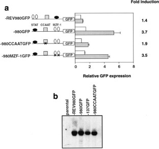 Previously, we have shown that interleukin-6 (IL-6) or leukemia inhibitory factor (LIF)-induced differentiation of the myeloid cell line M1 was associated with a rapid increase in the level of mRNA encoding the signaling adaptor protein, SKAP55R. Furthermore, enforced over-expression of SKAP55R in primary bone marrow cells inhibited colony growth. In this study, we have identified the cis-acting elements that control SKAP55R transcription in myeloid cells. The 980 bp genomic sequence upstream of the transcriptional start site was cloned into a GFP reporter vector for transient (293 cells) or stable (M1 cells) transfection assays. This region contained cis-acting elements necessary for transcriptional activity in unstimulated 293 cells (10-fold higher levels than the control vector) or unstimulated M1 cells (two-fold higher levels). Significant LIF-induced transcription was observed in M1 (3.4-fold induction, P < 0.001), but not 293 cells. Deletion reporter constructs defined a promoter region (−317/−137) essential for the transcriptional activity in M1 cells. This region contained a CCAAT element recently implicated in IL-6/LIF-induced transcriptional regulation of junB in M1 cells. Mutation of the CCAAT element (−250/−246) significantly reduced both basal and LIF-induced transcription (P < 0.01). Electrophoretic mobility shift assays demonstrated that NF-Y bound to the CCAAT element of both SKAP55R and junB. These results suggest NF-Y binding may be a common mechanism of IL-6/LIF–regulated transcription in myeloid cells.