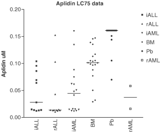 To determine the potential of aplidin as a cytotoxic agent in pediatric leukemia, we tested bone marrow (BM) and peripheral blood (PB) samples (n=72) of children with different types of leukemia and healthy children in the methyl-thiazol-tetrazolium assay. Also, we compared these results with other cytotoxic drugs. Aplidin was cytotoxic in vitro at nanomolar concentrations, in a dose-dependent fashion. L-carnitine, that is applied in clinical studies to prevent myotoxicity caused by aplidin, had no effect on aplidin cytotoxicity in vitro. Aplidin cytotoxicity in vitro was not different when initial and relapsed acute lymphoblastic leukemia (ALL) or initial ALL and initial acute myeloid leukemia were compared. However, normal BM (n=19) and PB (n=13) cells were more resistant to aplidin than leukemic cells (median two- to seven-fold, P=0.001 and median four- to 11-fold, P<0.0001, respectively). In leukemia samples, no significant crossresistance between aplidin and other cytotoxic drugs was found, except for a trend for correlation with 2′,2′-difluorodeoxycytidine (ρ=0.71, P=0.02). In normal BM samples, significant crossresistance with the epipodophyllotoxins was found, which is not readily explained by the currently known mechanisms of action of aplidin. In conclusion, we show that aplidin has selective cytotoxicity in vitro towards childhood leukemia cells and generally lacks crossresistance with other known cytotoxic drugs, which warrants clinical studies.