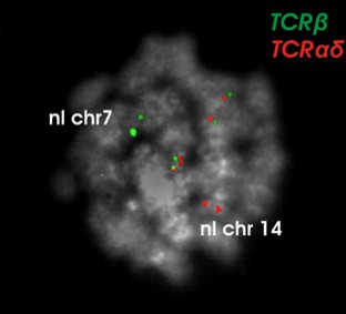 Chromosomal aberrations of T-cell receptor (TCR) gene loci often involve the TCRαδ (14q11) locus and affect various known T-cell oncogenes. A systematic fluorescent in situ hybridization (FISH) screening for the detection of chromosomal aberrations involving the TCR loci, TCRαδ (14q11), TCRβ (7q34) and TCRγ (7p14), has not been conducted so far. Therefore, we initiated a screening of 126 T-cell acute lymphoblastic leukemia (T-ALL) and T-cell lymphoblastic lymphoma cases and 19 T-ALL cell lines using FISH break-apart assays for the different TCR loci. Genomic rearrangements of the TCRβ locus were detected in 24/126 cases (19%), most of which (58.3%) were not detected upon banding analysis. Breakpoints in the TCRαδ locus were detected in 22/126 cases (17.4%), whereas standard cytogenetics only detected 14 of these 22 cases. Cryptic TCRαδ/TCRβ chromosome aberrations were thus observed in 22 of 126 cases (17.4%). Some of these chromosome aberrations target new putative T-cell oncogenes at chromosome 11q24, 20p12 and 6q22. Five patients and one cell line carried chromosomal rearrangements affecting both TCRβ and TCRαδ loci. In conclusion, this study presents the first inventory of chromosomal rearrangements of TCR loci in T-ALL, revealing an unexpected high number of cryptic chromosomal rearrangements of the TCRβ locus and further broadening the spectrum of genes putatively implicated in T-cell oncogenesis.
