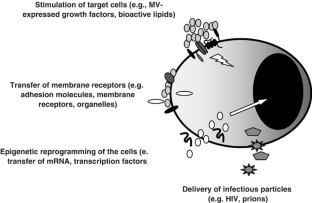 Normal and malignant cells shed from their surface membranes as well as secrete from the endosomal membrane compartment circular membrane fragments called microvesicles (MV). MV that are released from viable cells are usually smaller in size compared to the apoptotic bodies derived from damaged cells and unlike them do not contain fragmented DNA. Growing experimental evidence indicates that MV are an underappreciated component of the cell environment and play an important pleiotropic role in many biological processes. Generally, MV are enriched in various bioactive molecules and may (i) directly stimulate cells as a kind of ‘signaling complex’, (ii) transfer membrane receptors, proteins, mRNA and organelles (e.g., mitochondria) between cells and finally (iii) deliver infectious agents into cells (e.g., human immuno deficiency virus, prions). In this review, we discuss the pleiotropic effects of MV that are important for communication between cells, as well as the role of MV in carcinogenesis, coagulation, immune responses and modulation of susceptibility/infectability of cells to retroviruses or prions.