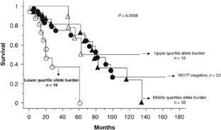 The clinical relevance of JAK2V617F allele burden in primary myelofibrosis (PMF) has not been previously studied. Bone marrow-derived DNA from 199 patients with PMF was subjected to qualitative (n=199) and quantitative (n=129) analysis for V617F. Mutational frequency was 58% and median mutant allele burden ratio in V617F-positive patients was 29% (range, 1–74%). Multivariable analysis identified older age, platelet count ⩾100 × 109 l−1 and peripheral blood blast percentage <3% as being associated with a positive mutational status. The mere presence of the mutation did not affect the incidence of thrombosis (P=0.78), overall survival (P=0.22) or leukemia-free survival (P=0.5). The 129 patients with allele burden information were divided into four groups: V617F-negative (n=53) and V617F-positive with mutant allele burden in the lower quartile (n=19), middle quartiles (n=38) or upper quartile (n=19) range. Kaplan–Meier plots revealed significantly shortened overall (P=0.0008) and leukemia-free (P=0.01) survival for the lower quartile, but not for upper quartile allele burden group; independent prognostic relevance was validated by multivariable analysis. We conclude that low V617F allele burden in PMF might indicate the presence of an overriding V617F-negative clone that confers a more aggressive disease phenotype.