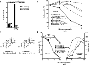 The orphan receptor CAR-β (ref. 1) binds DNA as a heterodimer with the retinoid-X receptor and activates gene transcription in a constitutive manner. Here we show that, in contrast to the classical nuclear receptors, the constitutive activity of CAR-β results from a ligand-independent recruitment of transcriptional co-activators. While searching for potential ligands of CAR-β, we found that the steroids androstanol and androstenol inhibit the constitutive activity of CAR-β. This effect is stereospecific: only 3α-hydroxy, 5α-reduced androstanes are active. These androstanes do not interfere with heterodimerization or DNA binding of CAR-β; instead, they promote co-activator release from the ligand-binding domain. These androstane ligands are examples of naturally occurring inverse agonists2,3 that reverse transcriptional activation by nuclear receptors. CAR-β (constitutive androstane receptor-β), therefore, defines an unanticipated steroidal signalling pathway that functions in a manner opposite to that of the conventional nuclear receptor pathways.