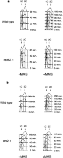 We have shown previously that chromosome VI of Saccharomyces cerevisiae contains nine origins of DNA replication that differ in initiation frequency and replicate sequentially during the S phase of the cell cycle1,2. Here we show that there are links between activation of these multiple origins and regulation of S-phase progression. We study the effects of a DNA-damaging agent, methyl methane sulphonate (MMS), and of mutations in checkpoint genes such as rad53 (ref. 3) on the activity of origins, measured by two-dimensional gel analysis, and on cell-cycle progression, measured by fluorescence-activated cell sorting. We find that when MMS slows down S-phase progression it also selectively blocks initiation from late origins. A rad53 mutation enhances late and/or inefficient origins and releases the initiation block by MMS. Mutation of rad53 also results in a late origin becoming early replicating. We conclude that rad53 regulates the timing of initiation of replication from late origins during normal cell growth and blocks initiation from late origins in MMS-treated cells. rad53 is, therefore, involved in the cell's surveillance of S-phase progression4,5. We also find that orc2, which encodes subunit 2 of the origin-recognition complex6,7, is involved in suppression of late origins.