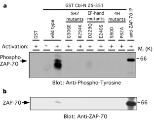 Lupher, M. L. J, Songyang, Z., Shoelson, S. E., Cantley, L. C. & Band, H. The Cbl phosphotyrosine-binding domain selects a D(N/D)XpY motif and binds to the Tyr292 negative regulatory phosphorylation site of ZAP-70. J. Biol. Chem. 272, 33140 –33144 (1997).
