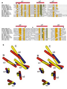 When activated, membrane-bound receptors for Fas and tumour-necrosis factor initiate programmed cell death by recruiting the death domain of the adaptor protein FADD1 (Mort1; ref. 2) to the membrane. FADD then activates caspase 8 (ref. 3) (also known as FLICE4 or MACH5) through an interaction between the death-effector domains of FADD and caspase 8. This ultimately leads to the apoptotic response. Death-effector domains and homologous protein modules known as caspase-recruitment domains6 have been found in several proteins1,2,3,4,5,6,7,8,9,10,11,12,13,14 and are important regulators of caspase (FLICE) activity and of apoptosis. Here we describe the solution structure of a soluble, biologically active mutant of the FADD death-effector domain. The structure consists of six antiparallel, amphipathic α-helices and resembles the overall fold of the death domains of Fas15 and p75 (ref. 16). Despite this structural similarity, mutations that inhibit protein–protein interactions involving the Fas death domain have no effect when introduced into the FADD death-effector domain. Instead, a hydrophobic region of the FADD death-effector domain that is not present in the death domains is vital for binding to FLICE and for apoptotic activity.