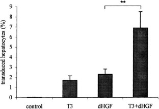 Retroviral vectors integrate into the target cell genome in a stable manner and therefore offer the potential for permanent correction of the genetic diseases that affect the liver. These vectors, however, usually require cell division to occur in order to allow provirus entry into the nucleus. We have explored clinically acceptable methods to improve the efficiency of retroviral gene transfer to the liver, which avoid the need for liver damage. Tri-iodothyronine (T3) and recombinant hepatocyte growth factor have previously been used to induce hepatocyte proliferation in rat livers and allow in vivo retroviral gene transfer. We investigated the combined effects of these growth factors, with their differing mechanisms of action, on hepatocyte proliferation in vivo and assessed their effectiveness in priming cells for retroviral gene transfer. During the phase of hepatocyte proliferation retrovirus was administered via either the portal or tail vein. Acting synergistically, T3 and a truncated form of recombinant hepatocyte growth factor (dHGF) induced 30% of hepatocytes in normal rat liver to enter DNA synthesis at 24 h. This increased proliferation enabled the liver to be transduced in vivo by retroviral vectors via either the portal or peripheral venous system, achieving transduction efficiencies of 6.9 ± 1.6% and 4.3 ± 0.4% respectively. Thus, the liver can be simply and conveniently transduced in vivo with integrating vectors, introduced via the peripheral venous system during a wave of growth factor-induced proliferation, pointing the way to clinically applicable gene transfer techniques.