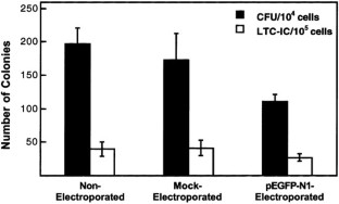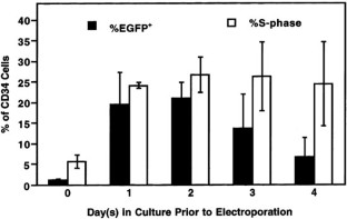 Introduction of foreign genes into human CD34+ hematopoietic precursor cells offers a means to correct inborn errors or to protect human stem cells from chemotherapeutic damage. Electroporation is a non-chemical, nonviral, highly reproducible means to introduce foreign genes into mammalian cells that has been used primarily for rapidly dividing cells. CD34+ cells isolated from mobilized peripheral blood of patients were cultured for 48 h in serum-free culture medium supplemented with Flt-3 ligand, stem cell factor and thrombopoietin. Cell cycle analysis showed an increase in % S-phase from 2% on day 0 to 28% on day 2 without significant loss of mean fluorescence intensity (MFI). Optimal electroporation conditions for CD34+ cells were 550 V/cm, 38 ms, 30 μg DNA/500 μl at cell densities between 0.2 × 106 and 10 × 106 cells/ml resulting in transient EGFP gene expression in 21% (± 1%) of CD34+ precursor cells, as determined by flow cytometry 48 h after electroporation. The more primitive cells were also found to be EGFP+ as determind by subset analysis using Thy1, CD38, AC133 and c-kit conjugated monoclonal antibodies. Methylcellulose assays on electroporated CD34+ cells yielded 20% (± 7%) EGFP+ colonies (CFU-GM, BFU-E and CFU-mix) and 22% (± 5%) EGFP+ long-term colony-initiating cells (LTC-IC). The reporter gene was found to be integrated into the LTC-IC genomic DNA as determined by inverse PCR and DNA sequencing. These results suggest that electroporation has the potential to effectively and stably deliver exogenous genes into human hematopoietic precursor cells.