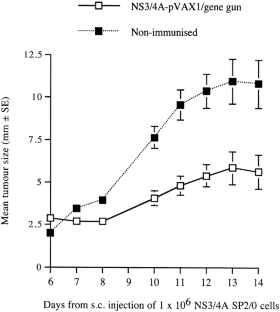 The hepatitis C virus (HCV) protease and helicase encompasses the nonstructural (NS) 3 protein and the cofactor NS4A, which targets the NS3/4A-complex to intracellular membranes. We here evaluate the importance of NS4A in NS3-based genetic immunogens. A full-length genotype 1 NS3/4A gene was cloned into a eucaryotic expression vector in the form of NS3/4A and NS3 alone. Transient transfections revealed that the inclusion of NS4A increased the expression levels of NS3. Subsequently, immunization with the NS3/4A gene primed 10- to 100-fold higher levels of NS3-specific antibodies as compared to immunization with the NS3 gene. Humoral responses primed by the NS3/4A gene had a higher IgG2a/IgG1 ratio (>20) as compared to the NS3 gene (3.0), suggesting a T helper 1-skewed response. Low dose i.m. (10 μg) immunization with the NS3/4A gene inhibited the growth of NS3/4A-expressing tumor cells in vivo, whereas the NS3 gene alone or NS3 protein did not. We then evaluated the efficiency of the NS3/4A gene administered by the gene gun, at the same doses used for humans, in priming cytotoxic T lymphocyte (CTL) responses. Three to four 4 μg doses of the NS3/4A gene primed CTL at a precursor frequency of 2–4%, which inhibited the growth of NS3/4A-expressing tumor cells in vivo. Thus, NS4A enhances the expression levels and immunogenicity of NS3, and an NS3/4A gene delivered transdermally could be a therapeutic vaccine candidate.