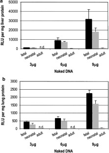We investigated the efficacy and safety of the cationic polymer polyethylenimine (PEI) as a potential tool for intrauterine gene delivery into livers of fetal mice in the last trimester of pregnancy (E17.5). Using luciferase as a reporter gene, transferrin-conjugated and ligand-free PEI/DNA complexes (containing 3 μg DNA) with varying PEI-nitrogen/DNA-phosphate (N/P) ratios and different PEI forms, branched (800, 25 kDa) and linear (22 kDa), were compared with naked DNA. Transgene expression was measured 48 h after administration of PEI/DNA complexes or naked DNA. Highest luciferase activity (9.8 × 103 relative light units (RLU)/mg of tissue protein) was observed with ligand-free PEI22/DNA mixtures at N/P 6.0. In addition, this formulation was associated with very low toxicity as compared to the other PEI/DNA-injected groups. Using β-galactosidase as a reporter gene, transfection of single, but also small, clusters of cells was demonstrated throughout the liver. Injection of 3 μg naked DNA resulted in an 11-fold lower transgene expression value (0.9 × 103 RLU/mg of tissue protein) as compared to PEI22/DNA complexes. However, the administration of higher concentrated naked DNA (9 μg) into fetal livers yielded expression levels of 3.2 × 104 RLU/mg of tissue protein, a more than three-fold increase compared to PEI22/DNA complexes. Furthermore, the gene transfer efficacy of concentrated naked DNA was approximately 40 times higher in fetuses than in adults (0.8 × 103 RLU/mg of tissue protein), indicating that fetal tissue is especially amenable to the uptake and expression of naked DNA.