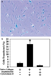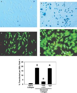 We previously demonstrated that DNA–polylactic–polyglycolic acid (PLGA)-coated stents can deliver genes to the arterial wall with reporter expression involving 1% of neointimal cells. The present study investigated a novel formulation utilizing denatured collagen in DNA-stent coatings; denatured collagen was hypothesized to enhance gene transfer due to adhesion molecule interactions and actin-related mechanisms. Arterial smooth muscle cells (SMCs) cultivated on denatured collagen had significantly greater plasmid DNA (β-galactosidase) transfection than SMC grown on native collagen (18.3±1.2 vs 1.0±0.1%, P<0.001). The denatured-collagen effect was completely blocked with anti-αvβ3 integrin antibody. SMCs cultivated on native collagen supplemented with tenascin-C (TN-C), a protein recognized by αvβ3 integrins, showed a 33-fold increase in transfection compared to control (P<0.001); this effect was also blocked with anti-αvβ3 antibody. We observed that cells grown on denatured collagen had marked F-actin-enriched stress fibers and intense perinuclear G actin, compared to those grown on native collagen, which demonstrated F-actin-enriched focal adhesions without perinuclear G-actin localization. Cytochalasin-D, an F actin depolymerizing agent, caused significantly increased SMC transfection in cells cultivated on native collagen compared to control cells (18.0±1.8 vs 3.02±0.9%, P<0.001) further supporting the view that actin-related cytoskeletal changes influence transfection. A denatured-collagen–PLGA composite vascular stent coating similarly resulted in increased plasmid DNA green fluorescent protein (GFP) expression compared to controls (P<0.001) in SMC cultures; the increased transfection was blocked by anti-αvβ3 antibody. Pig coronary studies comparing denatured-collagen–PLGA-coated stents containing plasmid DNA (encoding GFP) to coated stents without DNA demonstrated 10.8% of neointimal cells transfected; this level of expression was almost an order of magnitude greater than previously reported with a DNA delivery stent. It is concluded that denatured collagen incorporated into plasmid DNA-stent coating formulations may increase the level of gene expression in vitro and in vivo because of integrin-related mechanisms and associated changes in the arterial smooth muscle cell actin cytoskeleton.