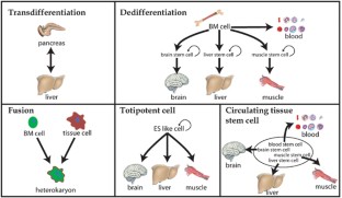 With the identification of stem cell plasticity several years ago, multiple reports raised hopes that tissue repair by stem cell transplantation could be within reach in the near future. Krause et al reported that a single purified hematopoietic stem cell not only repopulated the bone marrow of a host animal, but also integrated into unrelated tissues. Lagasse et al demonstrated that in a genetic model of liver disease, purified hematopoietic stem cells can give rise to hepatocytes and rescue fatal liver damage. More recent work by Jiang et al demonstrated that cultured cells can retain their stem cell potential. There are a number of possible mechanisms that could explain these phenomena, and recent experiments have raised controversy about which mechanism is prevalent. One possibility is transdifferentiation of a committed cell directly into another cell type as a response to environmental cues. Transdifferentiation has been shown mainly in vitro, but some in vivo data also support this mechanism. Direct transdifferentiation would clinically be limited by the number of cells that can be introduced into an organ without removal of resident cells. If bone marrow cells could on the other hand give rise to stem cells of another tissue, then they could in theory repopulate whole organs from a few starting cells. This model of dedifferentiation is consistent with recent data from animal models. Genetic analysis of cells of donor origin in vivo and in vitro has brought to light another possible mechanism. The fusion of host and donor cells can give rise to mature tissue cells without trans- or dedifferentiation. The resulting heterokaryons are able to cure a lethal genetic defect and do not seem to be prone to give rise to cancer. All these models will clinically face the problem of accessibility of healthy primary cells for transplantation. This underlines the importance of the recent identification of a population of mesenchymal stem cells (MSCs) with stem cell properties similar to embryonic stem (ES) cells. These cells can be cultured and expanded in vitro without losing their stem cell potential making them an attractive target for cell therapy. Finally, it is still not clear if stem cells for various tissues are present in peripheral blood, or bone marrow and thus can be directly purified from these sources. Identification of putative tissue stem cells would be necessary before purification strategies can be devised. In this review, we discuss the evidence for these models, and the conflicting results obtained to date.