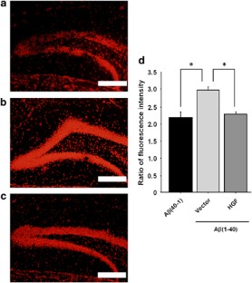 A new therapeutic approach to treat Alzheimer's disease (AD) is needed, and the use of growth factors is considered to be a candidate. Hepatocyte growth factor (HGF) is a unique multifunctional growth factor, which has the potential effect to exert neurotrophic action and induce angiogenesis. In this study, we examined the effects of overexpression of human HGF plasmid DNA using ultrasound-mediated gene transfer into the brain in an Aβ-infused cognitive dysfunction mouse model. We demonstrated that HGF gene transfer significantly alleviated Aβ-induced cognitive impairment in mice in behavioral tests. These beneficial effects of HGF might be due to (1) significant recovery of the vessel density in the dentate gyrus of the hippocampus, (2) upregulation of BDNF, (3) a significant decrease in oxidative stress and (4) synaptic enhancement. A pharmacological approach including gene therapy to increase the HGF level in combination with anti-Aβ therapy might be a new therapeutic option for the treatment of AD.
