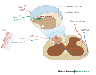 Selective ablation of lamina I neurons that express the NK1 receptor revealed that this population is pivotal in the signalling of pain and the central maintenance of hyperalgesia.