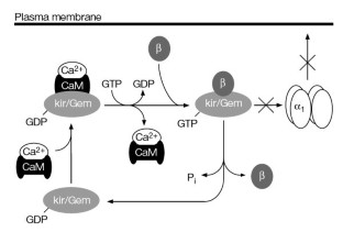 Voltage-dependent calcium (Ca2+) channels are involved in many specialized cellular functions1,2,3, and are controlled by intracellular signals such as heterotrimeric G-proteins4, protein kinases5,6 and calmodulin (CaM)7,8. However, the direct role of small G-proteins in the regulation of Ca2+ channels is unclear. We report here that the GTP-bound form of kir/Gem, identified originally as a Ras-related small G-protein that binds CaM9,10,11, inhibits high-voltage-activated Ca2+ channel activities by interacting directly with the β-subunit. The reduced channel activities are due to a decrease in α1-subunit expression at the plasma membrane. The binding of Ca2+/CaM to kir/Gem is required for this inhibitory effect by promoting the cytoplasmic localization of kir/Gem. Inhibition of L-type Ca2+ channels by kir/Gem prevents Ca2+-triggered exocytosis in hormone-secreting cells. We propose that the small G-protein kir/Gem, interacting with β-subunits, regulates Ca2+ channel expression at the cell surface.