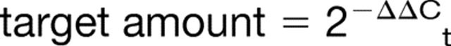 The amount of target, normalized to an endogenous reference (β-actin) and relative to the calibrator is defined by the ΔΔCt method as described by Livak K (Sequence Detector User Bulletin 2; Applied Biosystems). Specifically, the formula is applied as follows: