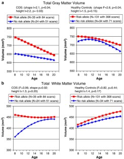 Childhood-onset schizophrenia (COS), defined as onset of psychosis by the age of 12, is a rare and malignant form of the illness, which may have more salient genetic influence. Since the initial report of association between neuregulin 1 (NRG1) and schizophrenia in 2002, numerous independent replications have been reported. In the current study, we genotyped 56 markers (54 single-nucleotide polymorphisms (SNPs) and two microsatellites) spanning the NRG1 locus on 78 COS patients and their parents. We used family-based association analysis for both diagnostic (extended transmission disequilibrium test) and quantitative phenotypes (quantitative transmission disequilibrium test) and mixed-model regression. Most subjects had prospective anatomic brain magnetic resonance imaging (MRI) scans at 2-year intervals. Further, we genotyped a sample of 165 healthy controls in the MRI study to examine genetic risk effects on normal brain development. Individual markers showed overtransmission of alleles to affecteds (P=0.009–0.05). Further, several novel four-marker haplotypes demonstrated significant transmission distortion. There was no evidence of epistasis with SNPs in erbB4. The risk allele (0) at 420M9-1395 was associated with poorer premorbid social functioning. Further, possession of the risk allele was associated with different trajectories of change in lobar volumes. In the COS group, risk allele carriers had greater total gray and white matter volume in childhood and a steeper rate of subsequent decline in volume into adolescence. By contrast, in healthy children, possession of the risk allele was associated with different trajectories in gray matter only and was confined to frontotemporal regions, reflecting epistatic or other illness-specific effects mediating NRG1 influence on brain development in COS. This replication further documents the role of NRG1 in the abnormal brain development in schizophrenia. This is the first demonstration of a disease-specific pattern of gene action in schizophrenia.