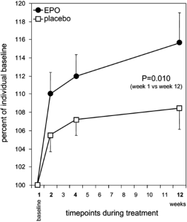 Schizophrenia is increasingly recognized as a neurodevelopmental disease with an additional degenerative component, comprising cognitive decline and loss of cortical gray matter. We hypothesized that a neuroprotective/neurotrophic add-on strategy, recombinant human erythropoietin (rhEPO) in addition to stable antipsychotic medication, may be able to improve cognitive function even in chronic schizophrenic patients. Therefore, we designed a double-blind, placebo-controlled, randomized, multicenter, proof-of-principle (phase II) study. This study had a total duration of 2 years and an individual duration of 12 weeks with an additional safety visit at 16 weeks. Chronic schizophrenic men (N=39) with defined cognitive deficit (⩾1 s.d. below normal in the Repeatable Battery for the Assessment of Neuropsychological Status (RBANS)), stable medication and disease state, were treated for 3 months with a weekly short (15 min) intravenous infusion of 40 000 IU rhEPO (N=20) or placebo (N=19). Main outcome measure was schizophrenia-relevant cognitive function at week 12. The neuropsychological test set (RBANS subtests delayed memory, language–semantic fluency, attention and Wisconsin Card Sorting Test (WCST-64) – perseverative errors) was applied over 2 days at baseline, 2 weeks, 4 weeks and 12 weeks of study participation. Both placebo and rhEPO patients improved in all evaluated categories. Patients receiving rhEPO showed a significant improvement over placebo patients in schizophrenia-related cognitive performance (RBANS subtests, WCST-64), but no effects on psychopathology or social functioning. Also, a significant decline in serum levels of S100B, a glial damage marker, occurred upon rhEPO. The fact that rhEPO is the first compound to exert a selective and lasting beneficial effect on cognition should encourage new treatment strategies for schizophrenia.
