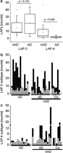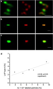 The diagnostic potential of large Aβ-peptide binding particles (LAPs) in the cerebrospinal fluid (CSF) of Alzheimer's dementia (AD) patients and non-AD controls (nAD) was evaluated. LAPs were detected by confocal spectroscopy in both groups with high inter-individual variation in number. Molecular imaging by confocal microscopy revealed that LAPs are heterogeneous superaggregates that could be subdivided morphologically into four main types (LAP1–4). LAP-4 type, resembling a ‘large chain of pearls’, was detected in 42.1% of all nAD controls but it was virtually absent in AD patients. LAP-4 type could be selectively removed by protein A beads, a clear indication that it contained immunoglobulins in addition to beta-amyloid peptides (Aβ1-42). We observed a close correlation between LAPs and immunoglobulin G (IgG) concentration in CSF in controls but not in AD patients. Double labeling of LAPs with anti-Aβ and anti-IgG antibodies confirmed that LAP-4 type consisted of Aβ and IgG aggregates. Our results assign a central role to the immune system in regulating Aβ1-42 homeostasis by clustering this peptide in immunocomplexes.