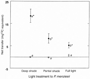 Different plant species can be compatible with the same species of mycorrhizal fungi1,2 and be connected to one another by a common mycelium3,4. Transfer of carbon3,4,5, nitrogen6,7 and phosphorus8,9 through interconnecting mycelia has been measured frequently in laboratory experiments, but it is not known whether transfer is bidirectional, whether there is a net gain by one plant over its connected partner, or whether transfer affects plant performance in the field10,11. Laboratory studies using isotope tracers show that the magnitude of one-way transfer can be influenced by shading of ‘receiver’ plants3,5, fertilization of ‘donor’ plants with phosphorus12, or use of nitrogen-fixing donor plants and non-nitrogen-fixing receiver plants13,14, indicating that movement may be governed by source–sink relationships. Here we use reciprocal isotope labelling in the field to demonstrate bidirectional carbon transfer between the ectomycorrhizal tree species Betula papyrifera and Pseudotsuga menziesii, resulting in net carbon gain by P. menziesii. Thuja plicata seedlings lacking ectomycorrhizae absorb small amounts of isotope, suggesting that carbon transfer between B. papyrifera and P. menziesii is primarily through the direct hyphal pathway. Net gain by P. menziesii seedlings represents on average 6% of carbon isotope uptake through photosynthesis. The magnitude of net transfer is influenced by shading of P. menziesii, indicating that source–sink relationships regulate such carbon transfer under field conditions.