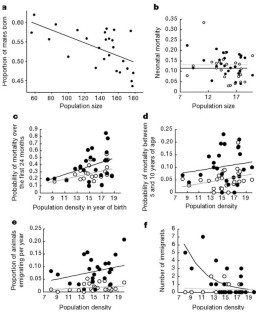 Kruuk, L. E. B., Clutton-Brock, T. H., Albon, S. D., Pemberton, J. M. & Guinness, F. E. Population density affects sex ratio variation in red deer. Nature 399, 459–461 (1999).