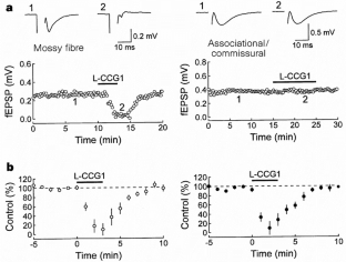 Kamiya, H., Shinozaki, H. & Yamamoto, C. Activation of metabotropic glutamate receptor type 2/3 suppresses transmission at rat hippocampal mossy fibre synapses. J. Physiol. (Lond.) 493, 447–455 (1996).