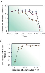 A common assumption is that breeding in polygnous systems is not limited by the number of males because one male can inseminate many females1,2. But here we show that reproductive collapse in the critically endangered saiga antelope (Saiga tatarica tatarica) is likely to have been caused by a catastrophic drop in the number of adult males in this harem-breeding ungulate, probably due to selective poaching for their horns. Fecundity and calf survival are known to be affected by markedly skewed sex ratios3, but in the saiga antelope the sex ratio has become so distorted as to lead to a drastic decline in the number of pregnancies — a finding that has implications both for the conservation of the species and for understanding the reproductive ecology of polygynous ungulates.
