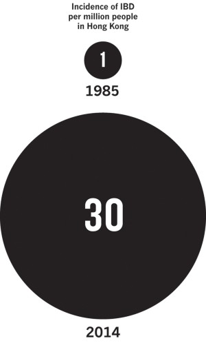 And she has the data to support this statement. Ng also leads the Asia-Pacific Crohn's and Colitis Epidemiology Study (ACCESS), which, for the past five years, has tracked new cases of Crohn's disease and ulcerative colitis — the two major forms of IBD — across 13 countries in Asia as well as Australia. The incidence of IBD in Hong Kong has grown from just 1 case in a million in 1985 to a little over 30 in every million in 2014 (ref. 1).