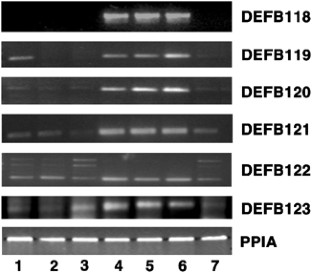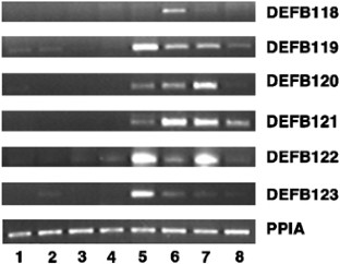Defensins are members of a large diverse family of cationic antimicrobial peptides that share a signature pattern consisting of six conserved cysteine residues. Defensins have a wide variety of functions and their disruption has been implicated in various human diseases. Here we report the characterization of DEFB119–DEFB123, five genes in the human β-defensin cluster locus on chromosome 20q11.1. The genomic structures of DEFB121 and DEFB122 were determined in silico. Sequences of the five macaque orthologs were obtained and expression patterns of the genes were analyzed in humans and macaque by semiquantitative reverse transcription polymerase chain reaction. Expression was restricted to the male reproductive tract. The genes in this cluster are differentially regulated by androgens. Evolutionary analyses suggest that this cluster originated by a series of duplication events and by positive selection. The evolutionary forces driving the proliferation and diversification of these defensins may be related to reproductive specialization and/or the host–parasite coevolutionary process.